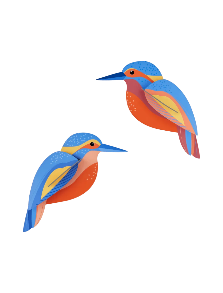Tuinvogels kwetteren rondom ons, ze pikken wat kruimels , kijken even om zich heen en fladderen dan weer op. Ze kleuren ons dagelijks leven. Deze kartonnen ijsvogels niet weg en kan je een mooi plekje aan je muur geven.