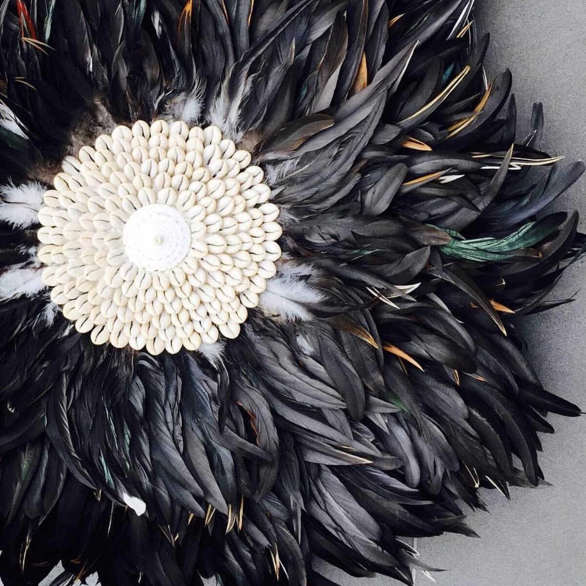 Onze prachtige wanddisplay met zwarte veren is een echte bohemien schoonheid om elke muur in je interieur, overdekt terras of tuin te versieren. De middencirkel is omgeven door met de hand geplaatste schelpen.