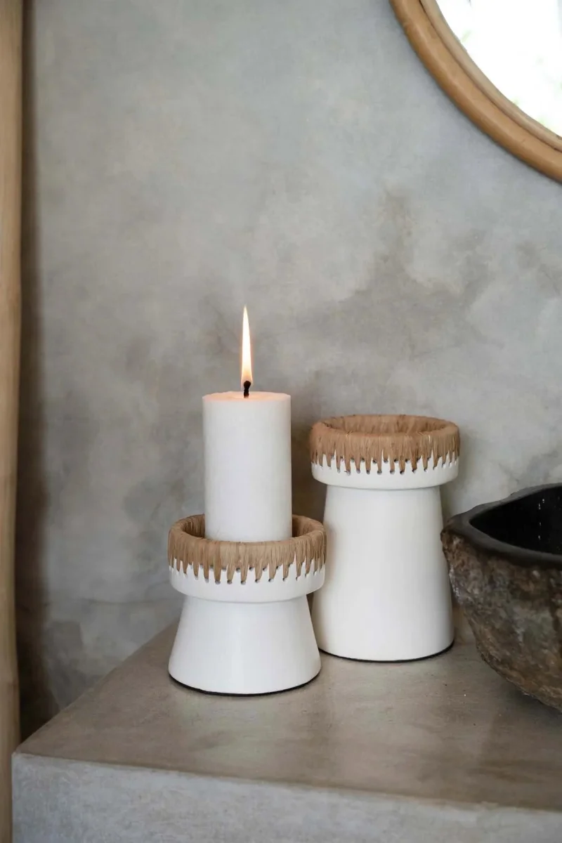 Mooi is hij zeker, deze Pretty kandelaar! De combinatie van wit terracotta en een raffia-accent bovenop maakt dit een zeer stijlvolle toevoeging aan elke ruimte. Er zijn drie hoogtes – door ze te combineren creëer je een verbluffende look op je tafel, console of zelfs de rand van je badkuip!