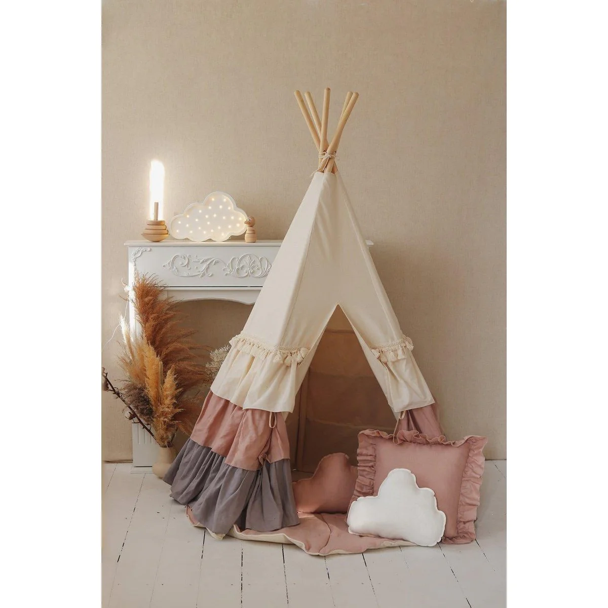 Je kleine avonturier kan urenlang de wereld verkennen en spelen, maar bij terugkomst heeft hij of zij een plek nodig om uit te rusten, te eten en plannen te maken voor verdere avonturen. Een tipi betekent letterlijk een woning, en is een woord dat wordt gebruikt door de Sioux, de inheemse bevolking van de Great Plains. Het is een ruimte voor allerlei soorten plezier. Als het spelen klaar is, kun je de tipi weer in de hoes inpakken en bijvoorbeeld in de hoek van de kamer opbergen. Opgevouwen neemt hij niet veel ruimte in beslag en dankzij de hoes neem je hem gemakkelijk mee naar buiten. Binnenin zit een vakje waarin kinderen hun speelgoed, boeken en andere schatten kunnen verstoppen. ONDERDEEL VAN DE BOHO STYLE COLLECTIE Boho is een artistieke bohemien stijl, geleid door comfort, zomer en vrijheid. Je vindt hier en daar wat etnische verwijzingen, een aantal bloemen waar mogelijk, en natuurlijkheid – een knipoog naar Moeder Natuur. Onze poederkleurige tipi ‘Powder Frills’, stevig genaaid van dikke katoenen stof, versierd met prachtige linnen franjes in poederroze en grijze kleuren. Perfect voor kleine royalty’s! Gemaakt van natuurlijke materialen: 100% katoen, 100% linnen stoffen en grenen palen. Dankzij de vijfwandige structuur is de tent stabiel wanneer hij wordt opgezet, de stokken zijn afgerond en geplaatst in tunnels die aan de onderkant aan elkaar zijn genaaid. De tipi is perfect voor gebruik in huis, in de tuin of op het strand. De set bestaat uit een speeltent, stokken en een katoenen hoes. Vul het gerust aan met onze prachtige decoraties en accessoires. Stof: 100% katoen, 100% linnen OEKO-TEX® gecertificeerd. Gewicht stof: 260. Wastemperatuur: tot 30°C. Grenenpalen: 180 cm. Hoogte opgebouwd: 170 cm. Diameter voet: 120/130 cm.