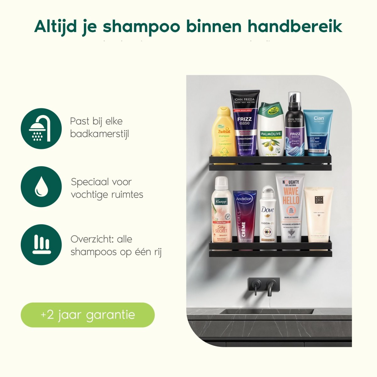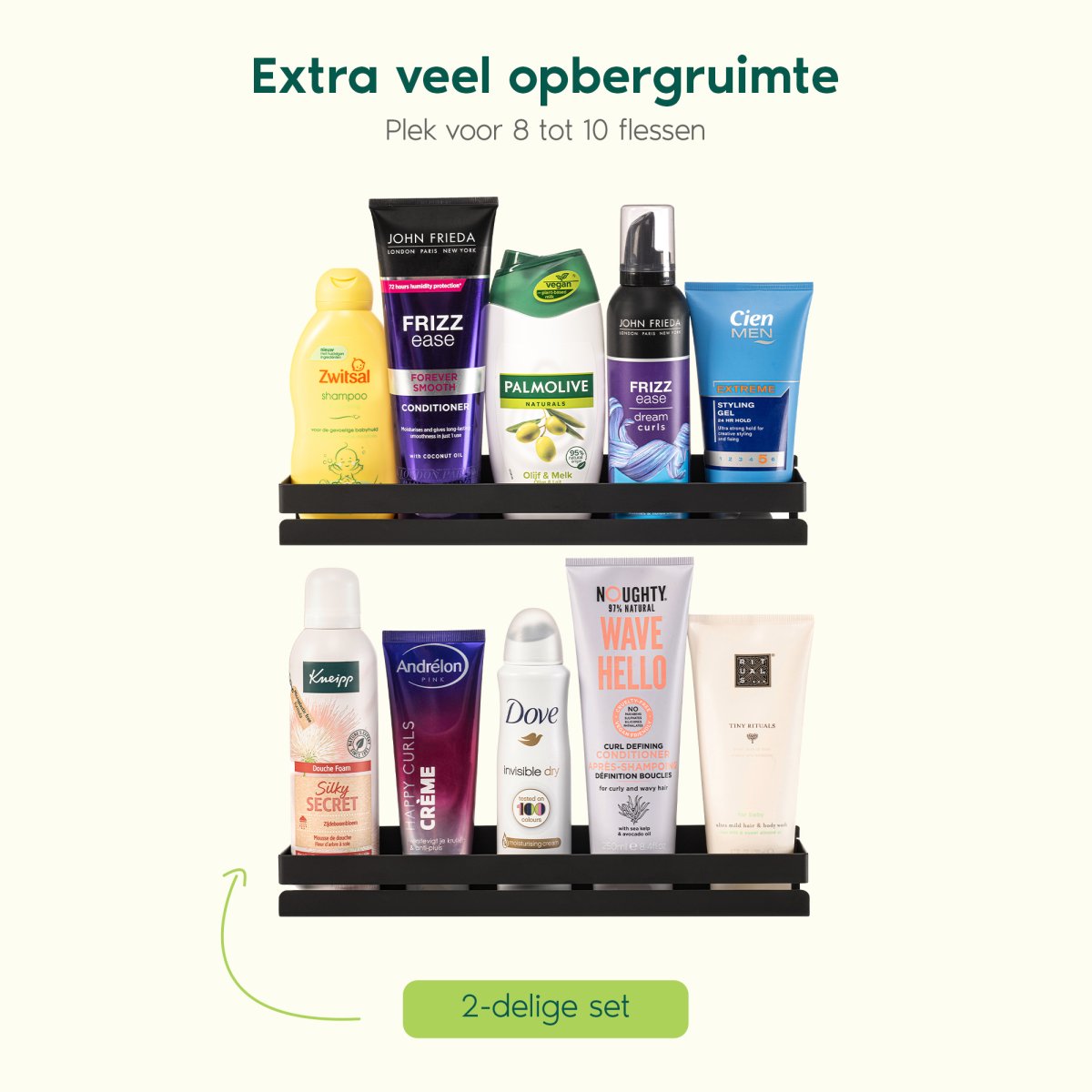 Heb je genoeg van rondslingerende shampooflessen? Met het stijlvolle dubbele doucherek in matzwart heb je voortaan al je douchespullen netjes op één plek!