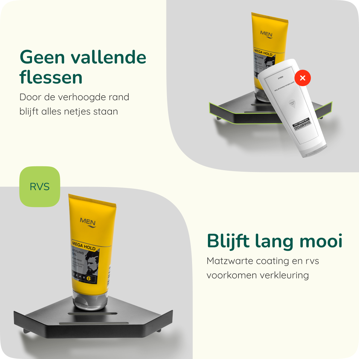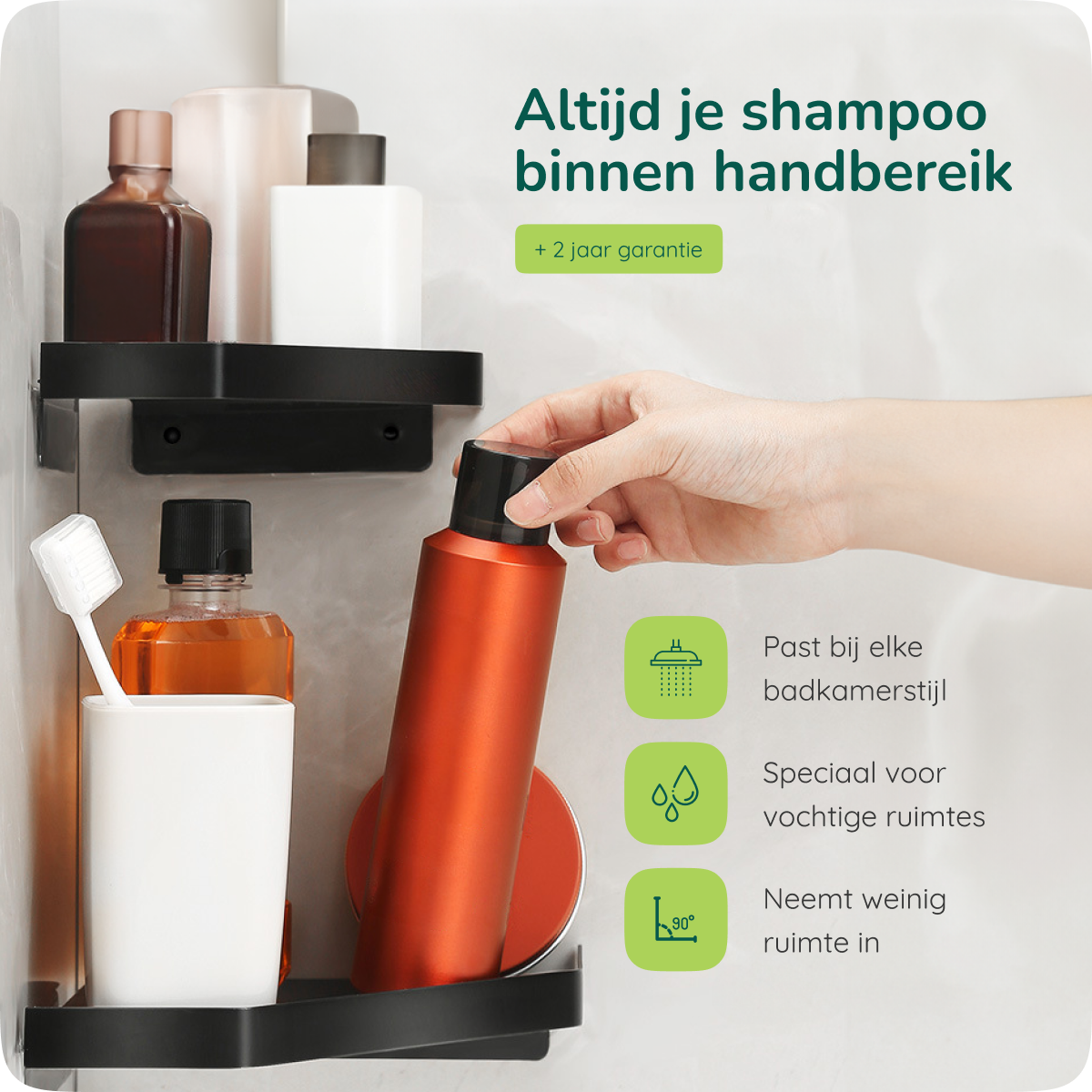 Het badkamer hoekrek heeft een compact design, maar is ruim genoeg om meerdere flessen shampoo, conditioner en scheerschuim op te zetten. Zo heb jij al jouw favoriete douchespullen binnen handbereik. Nooit meer bukken of flessen omstoten!