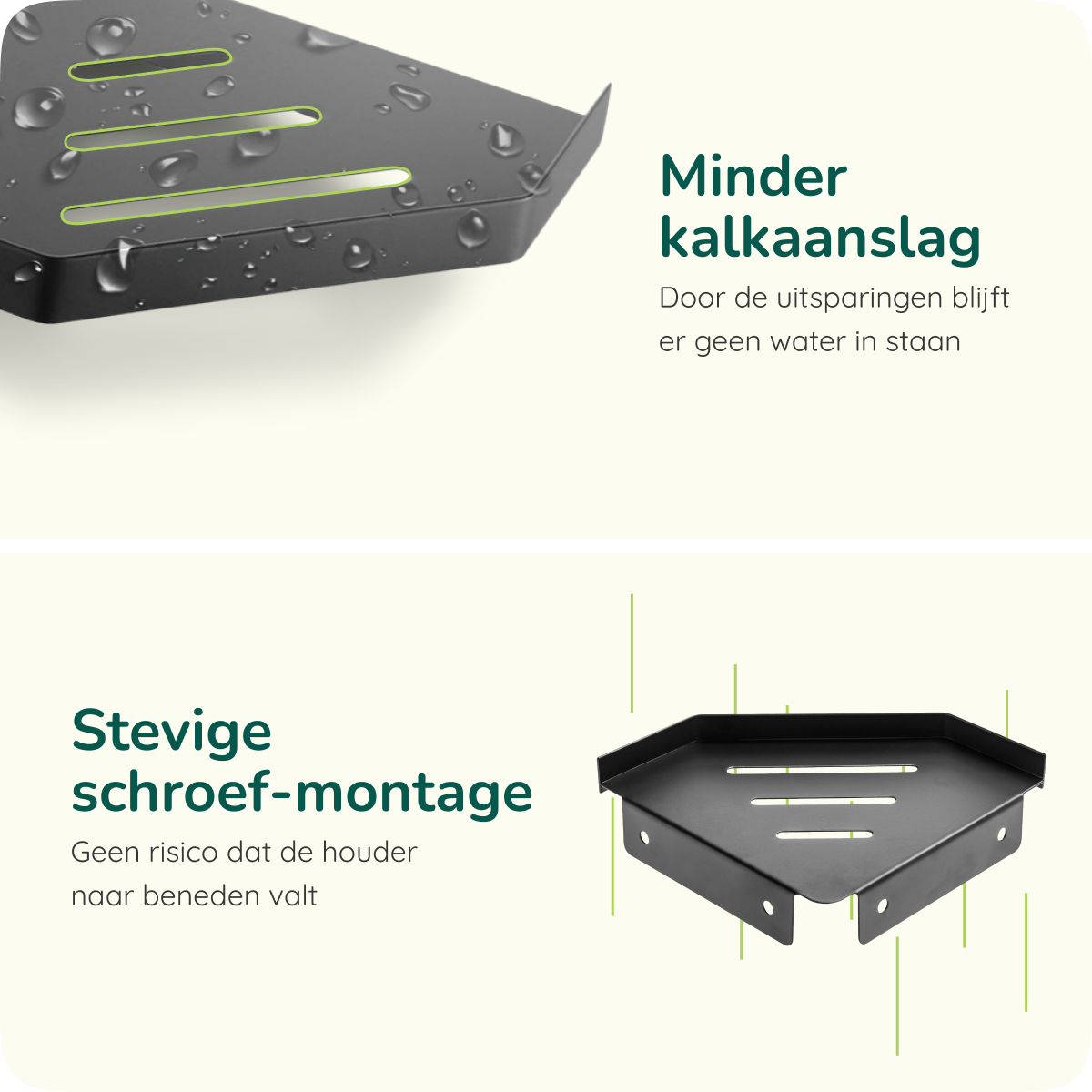 Door het rvs materiaal met matzwarte coating ziet het rekje er luxe uit én geniet je van een lange gebruiksduur. Rvs beschermt namelijk tegen water in de douche en voorkomt roest. Doordat er afvoergaten in het rekje zitten, blijft het water ook minder goed staan. Zo heb je minder last van kalkaanslag.