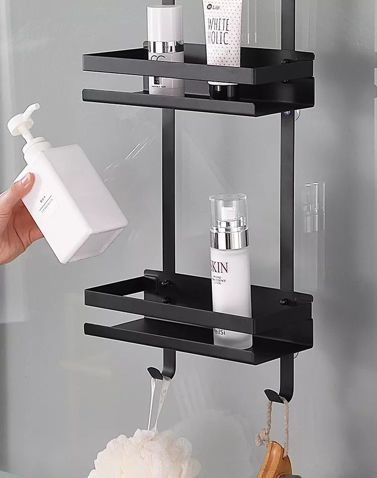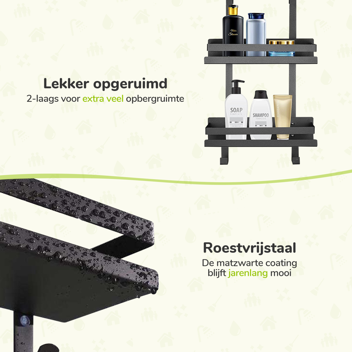 Het hangend doucherek is voorzien van 2-lagen voor al jouw douchespullen. Berg shampoo, douchegel, conditioner, scheerschuim en mesjes netjes op. Altijd binnen handbereik!
