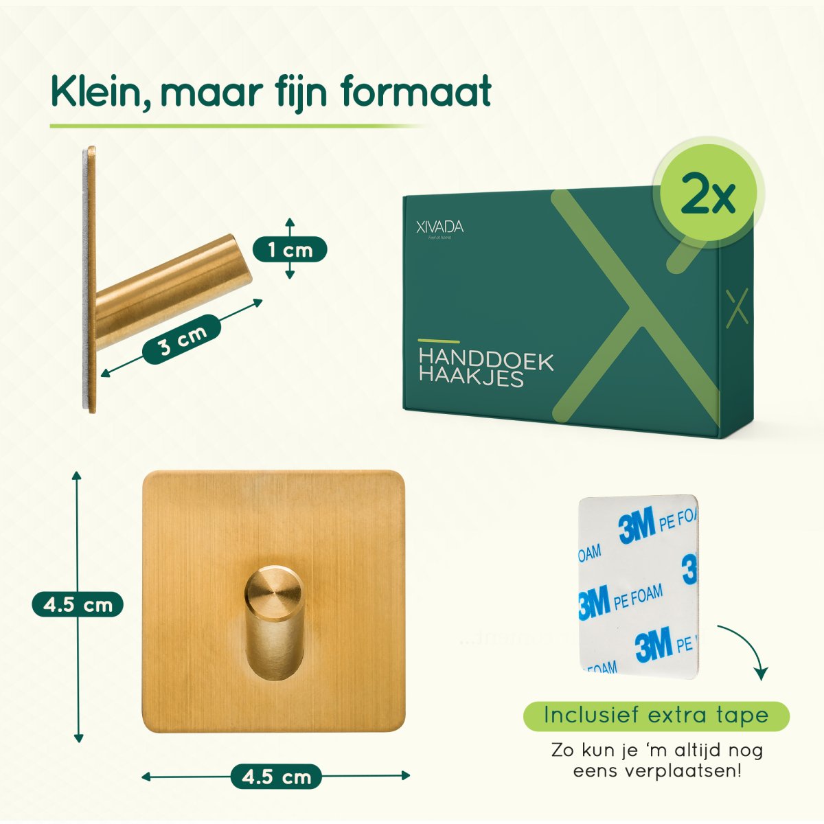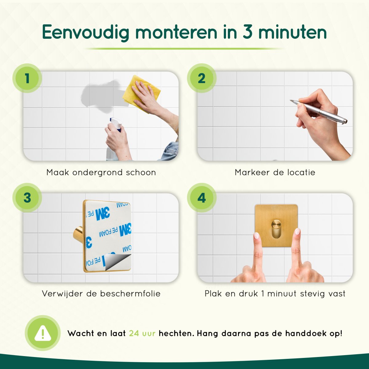 De gouden handdoekhaakjes monteer je eenvoudig op de muur met premium 3M tape. Voor een langdurig resultaat, zonder gereedschap!