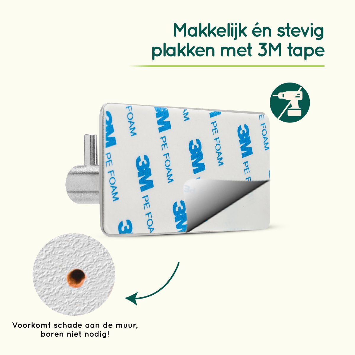 Geen klusser en bang om de muur te beschadigen? De zelfklevende haakjes zijn binnen 1 minuut bevestigd, zonder dat je hoeft te boren.