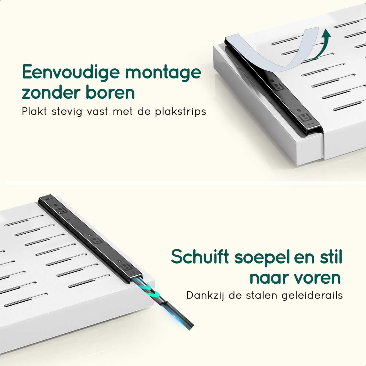 De schuiflade bestaat uit een frame van sterk aluminium met stalen geleiders. De nanotape is krachtig zodat hij jarenlang blijft zitten. Het systeem draagt makkelijk 25 KG zoals zware pannen, servies, voedingsmiddelen, schoonmaakspullen of keukenapparaten.