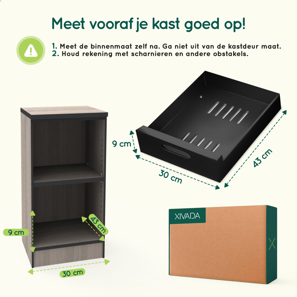 Het is super belangrijk dat je vooraf de beschikbare ruimte meet. Meet de binnenmaat en ga niet zo maar uit van de afmeting van de kastdeur. De zijkanten van de kast en de scharnieren nemen namelijk ook ruimte in. Het ladesysteem is beschikbaar in 25 – 30 – 35 cm en in een verstelbare maat van 43 tot 67 cm.