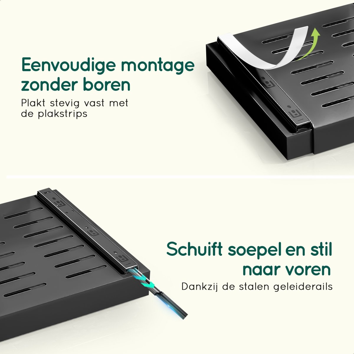 Nooit snel bij je voorraad kunnen of altijd aan het zoeken in een rommelige keukenkast? Maak het jezelf gemakkelijker met een keukenkast organizer ladesysteem. Perfect voor de gootsteenkast of keukenkastjes. Zo staan al je keukenspullen netjes op hun plek én schuif je ze makkelijk naar voren.