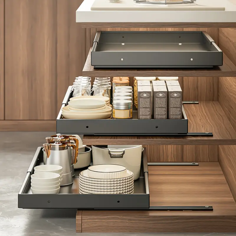 Niet meer rommelen in je keukenkast omdat je moeilijk bij het achterste spullen kunt. Je trekt de lade eenvoudig naar voren zodat alles voor het grijpen ligt. Dankzij de geleiderails schuift de lade stil en soepel in en uit.