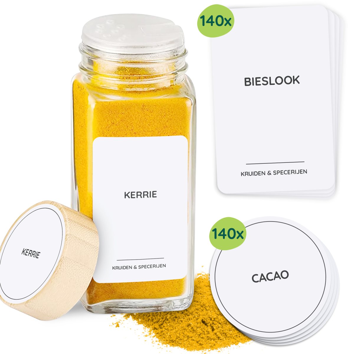 In de set vind je meer dan 100 soorten kruiden en specerijen. De meest voorkomende kruiden hebben we voorgedrukt op een label. Natuurlijk in het Nederlands. Mis je nog iets? In elk pakket zitten blanco labels, waar je zelf een naam op kan schrijven.