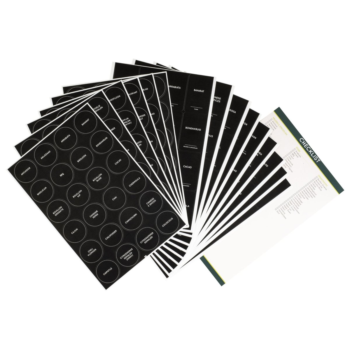 In de set vind je meer dan 100 soorten kruiden en specerijen. De meest voorkomende kruiden hebben we voorgedrukt op een label. Natuurlijk in het Nederlands. Mis je nog iets? In elk pakket zitten blanco labels, waar je zelf een naam op kan schrijven.