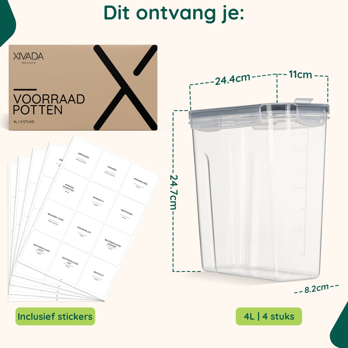 Ontbijtgranen, zaden of hagelslag makkelijk doseren en in je ontbijt strooien? De 4-delige voorraadbussen set met handige strooideksel maakt jouw ochtend gemakkelijk. Een complete set om al jouw etenswaren luchtdicht te bewaren, labelen en organiseren. Houd je eten langer vers én maakt van elk ontbijt een feestje!