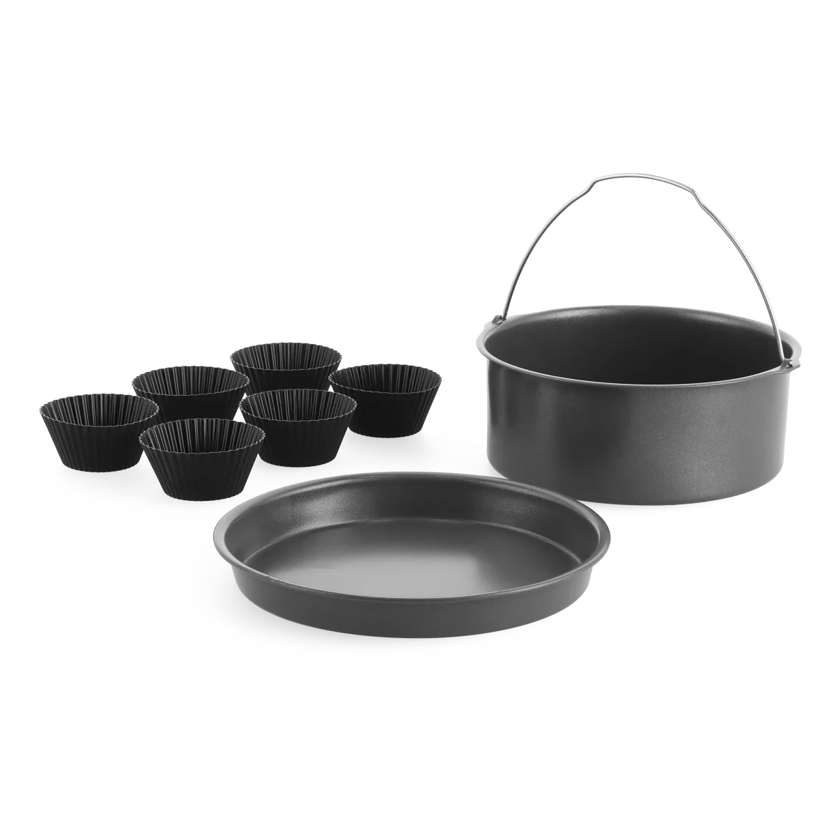 De quiche- en pizzavorm, en de bakvorm hebben een geavanceerde PFAS-VRIJE keramische antiaanbaklaag. De muffinvormen zijn gemaakt van gladde silicone. Deze 8-delige set is geschikt voor alle airfryermanden met een minimale inhoud van 6 liter.